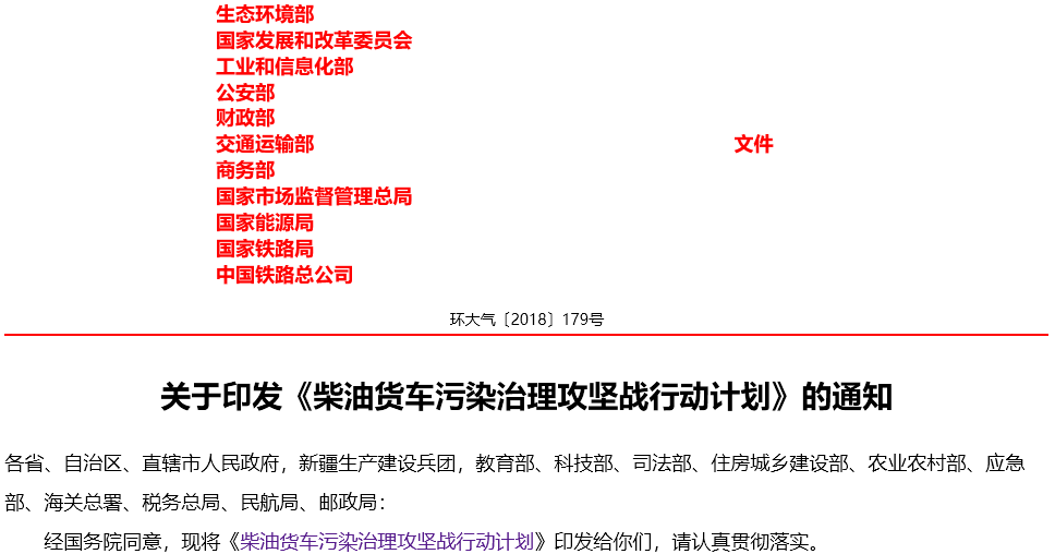 2019年1月4日,生态环境部等11个部门印发《柴油货车污染治理攻坚战行动计划》,明确了加强柴油车超标排放治理,规定在2020年底前,京津冀及周边地区、汾渭平原加快淘汰国三及以下排放标准营运柴油货车100万辆以上。据了解,目前已淘汰40万辆。