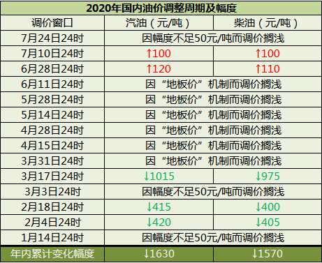 按照现行机制,国内汽、柴油价格根据国际市场原油价格变化每10个工作日调整一次。当调价幅度低于每吨50元时,不作调整,纳入下次调价时累加或冲抵。