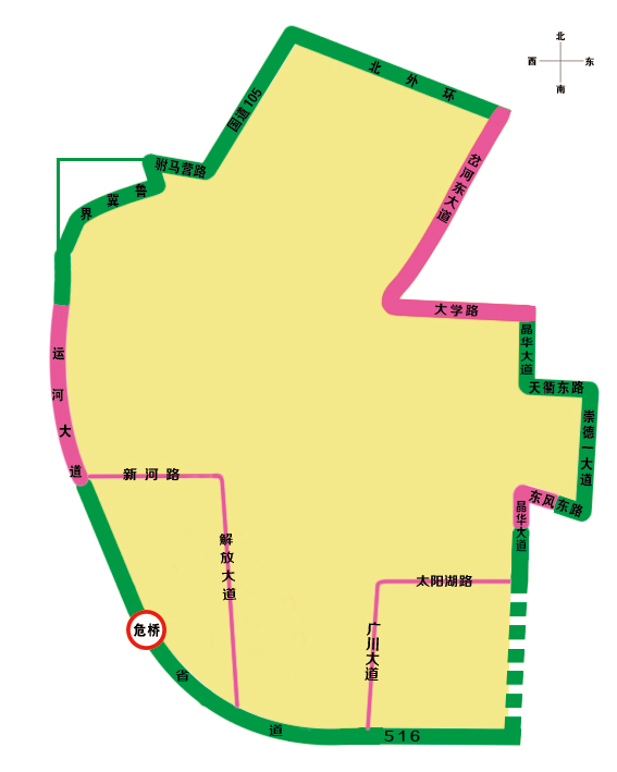 驸马营路—G105—北外环—岔河东大道—大学东路—晶华大道(北段)—天衢东路—崇德一大道—东风东路—晶华大道(南段)—S516—运河大道—鲁冀界以内。